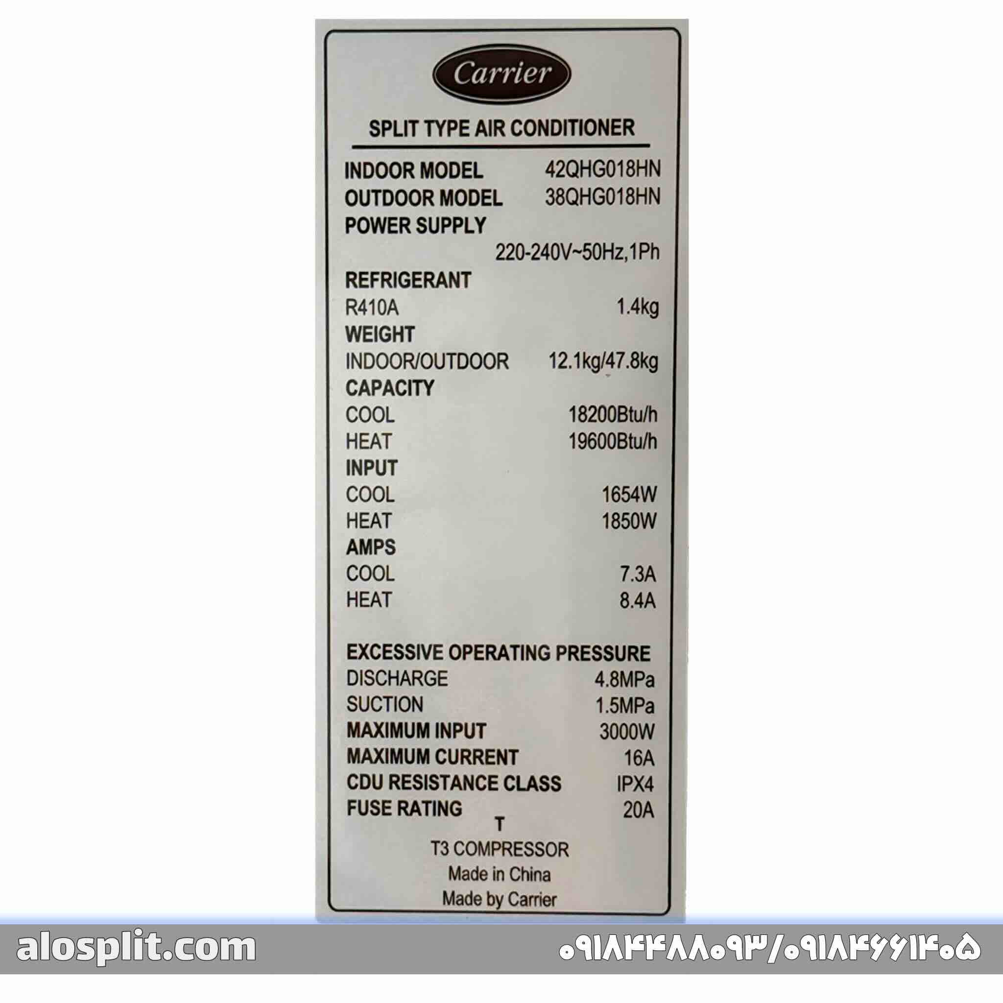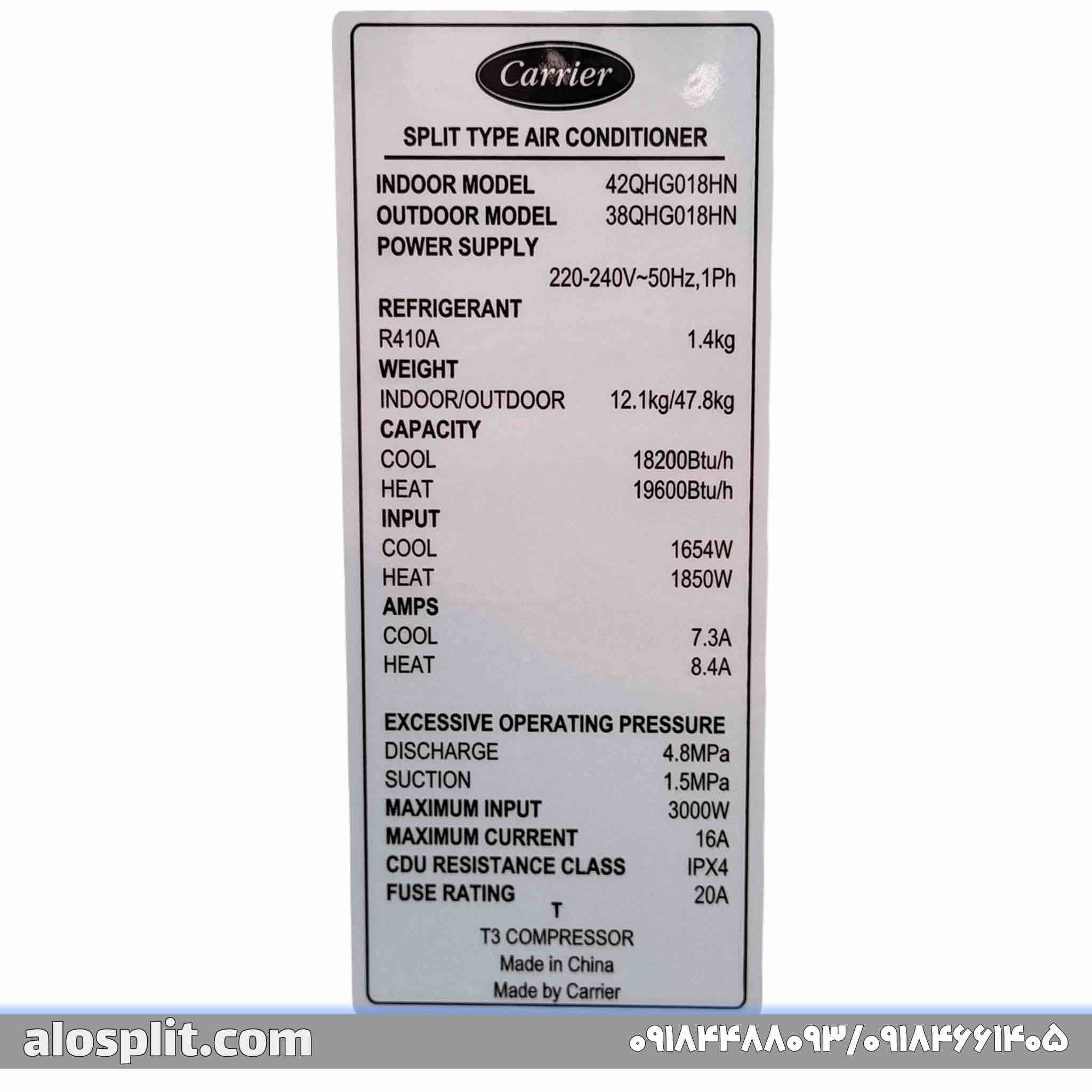 کولر گازی کریر 18000معمولی QHG، مدل 42QHG018H – 38QHG018H