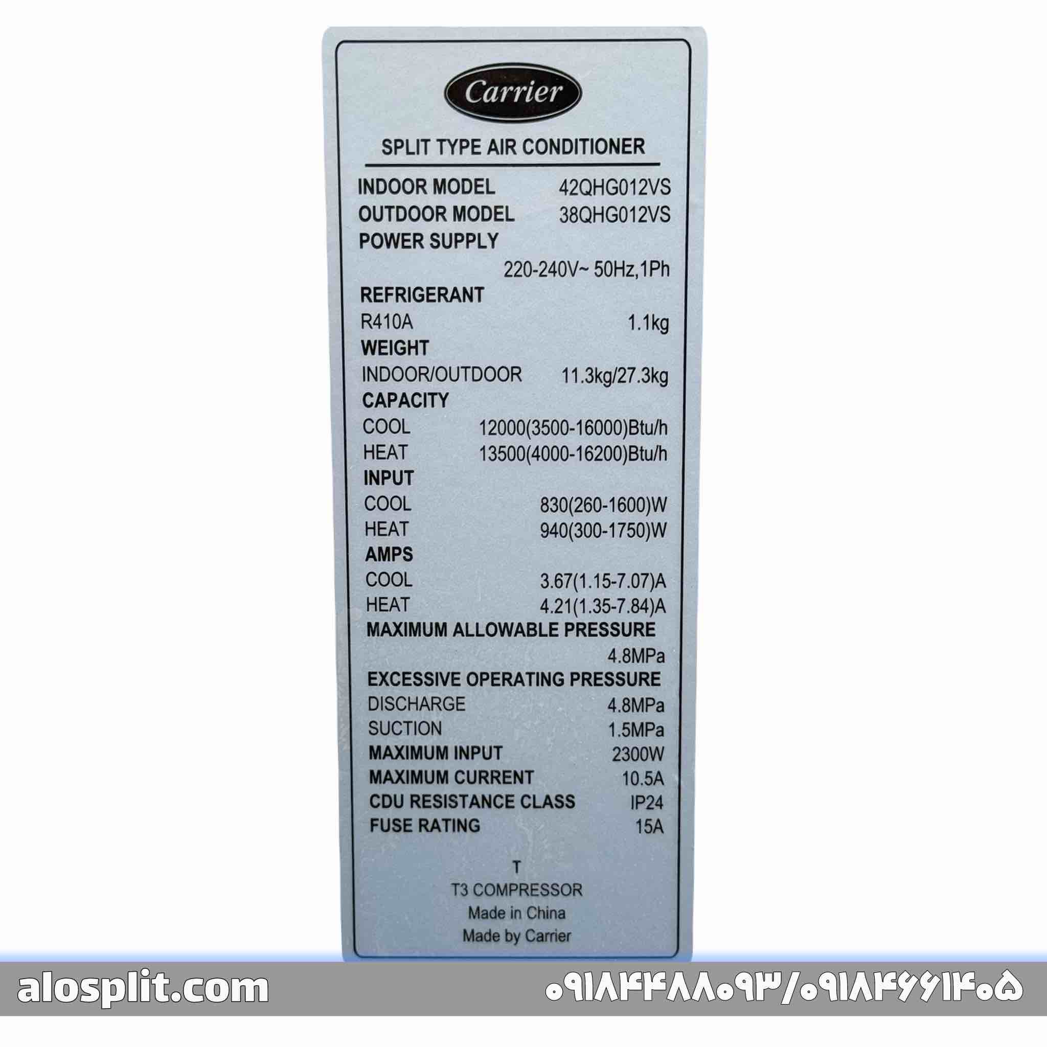 کولر گازی کریر ۱۲۰۰۰ اینورتر QHG، مدل 42QHG012VS – 38QHG012VS